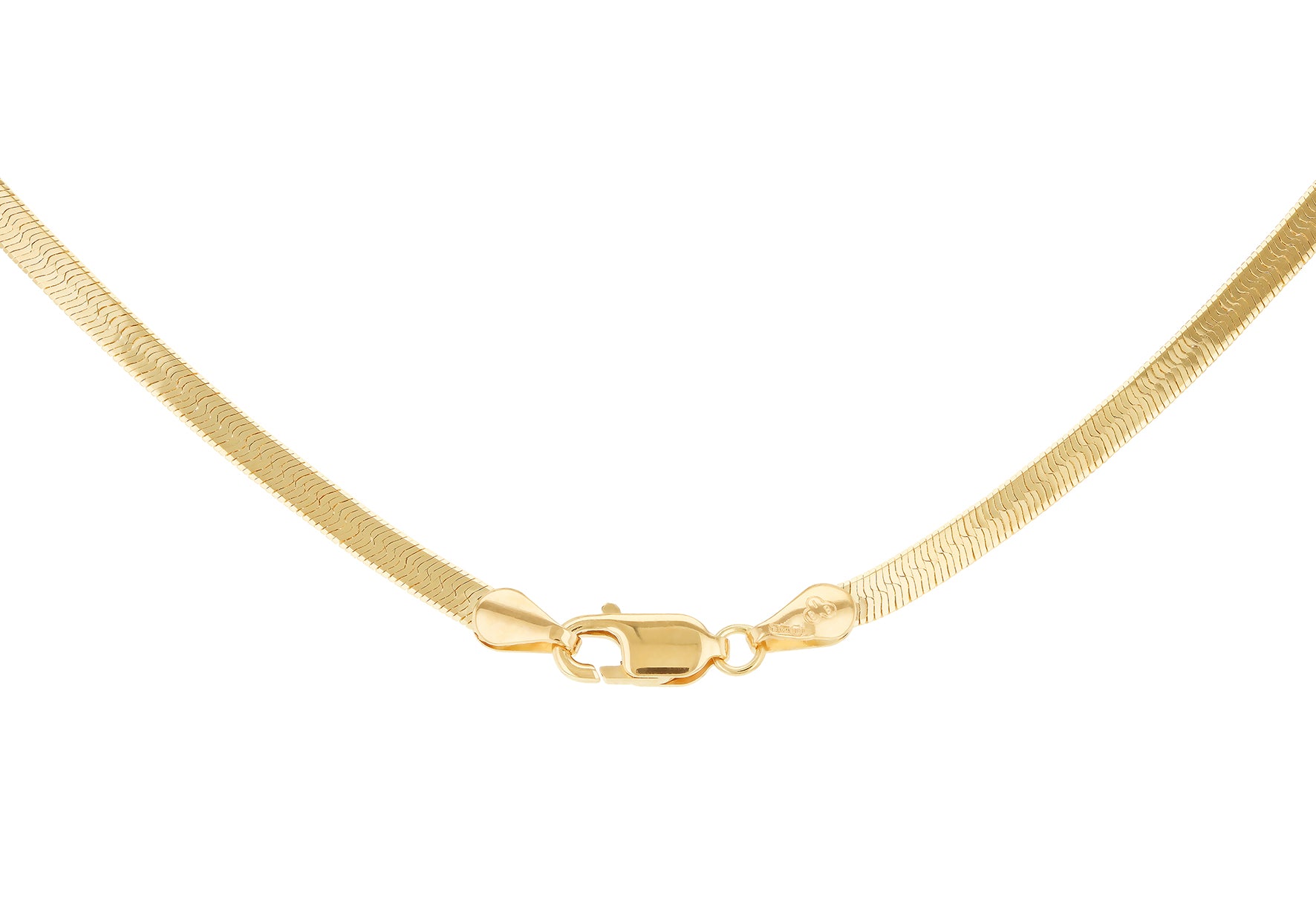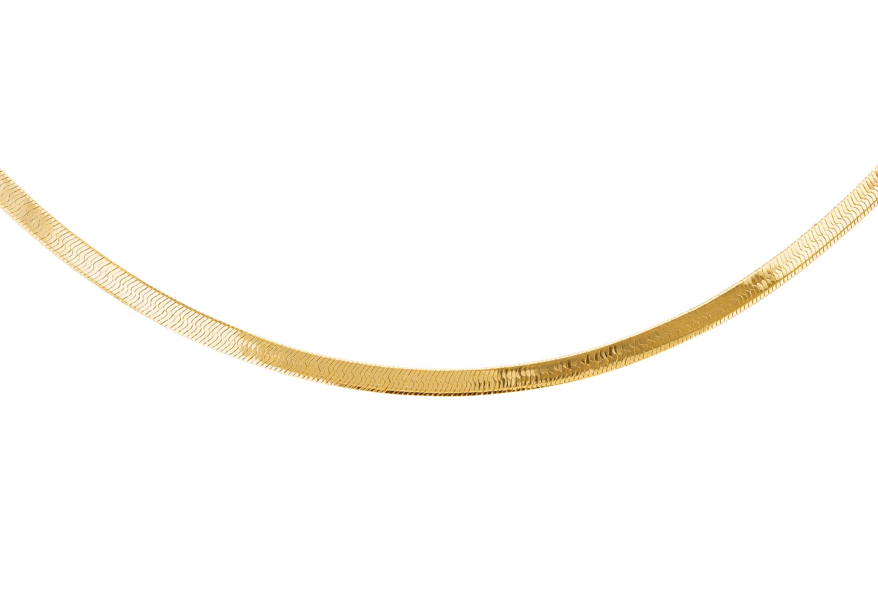 This fine gold Herringbone Chain Necklace is a refined expression of timeless style, showcasing a fluid, mirror-like surface that lies flat against the skin with elegant ease. The intricate pattern of tightly woven links creates a sleek, serpentine effect, delivering a soft, graceful drape with subtle movement. Whether worn solo or layered, its high-polish finish and distinctive texture offer an effortlessly elevated look, sophisticated in its simplicity, yet unmistakably luxurious.