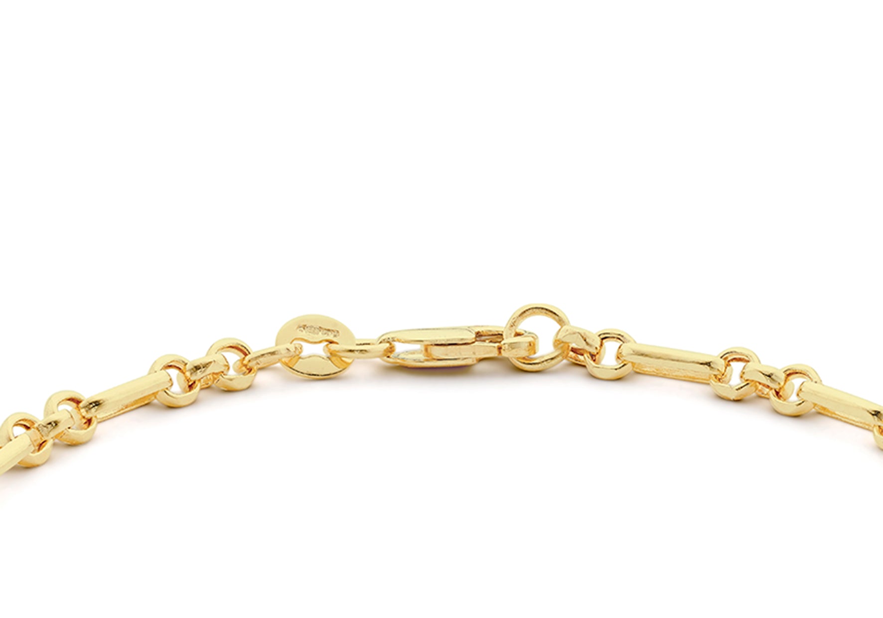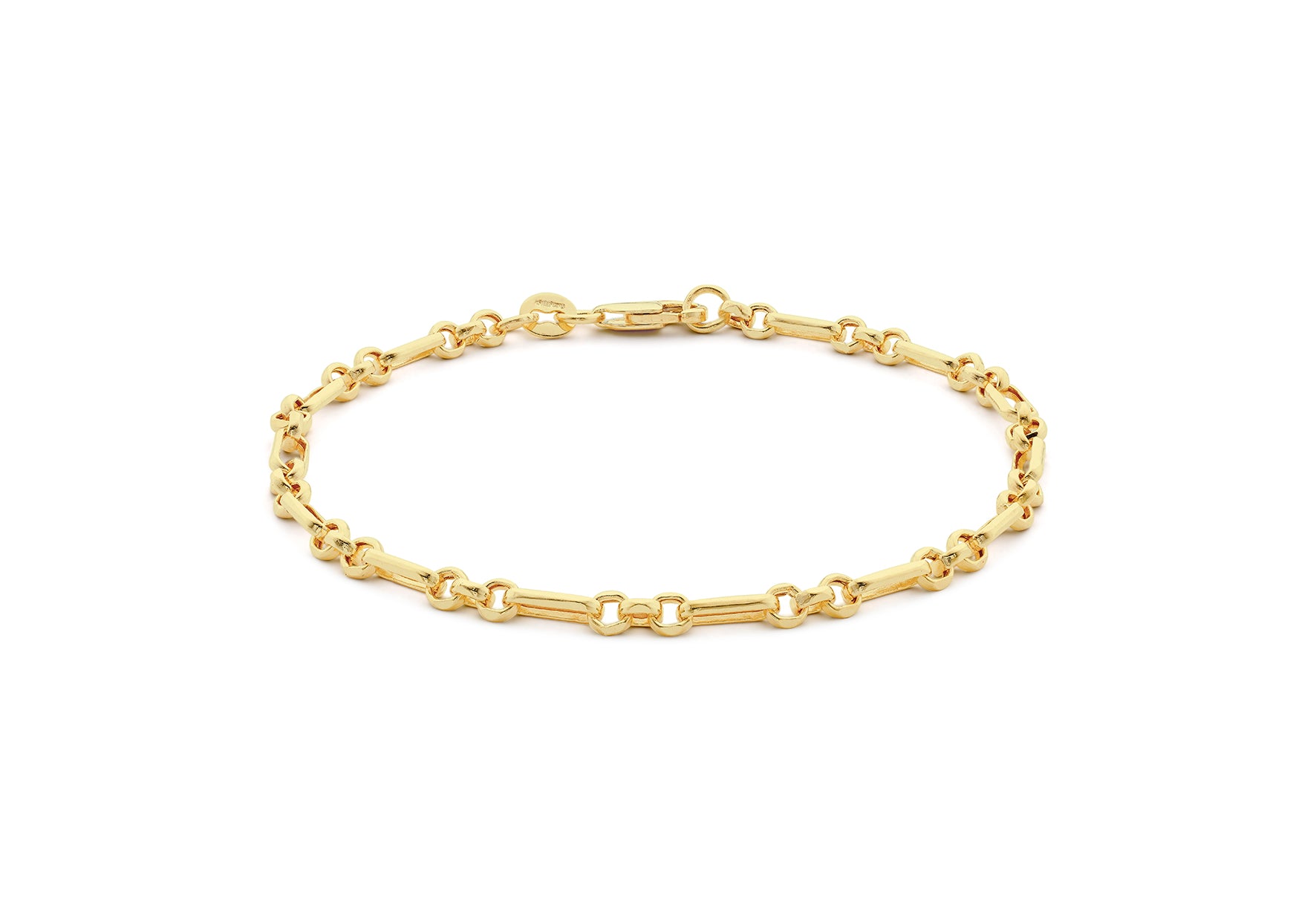 An enduring classic redefined with refined craftsmanship, this bracelet showcases the richness of 18ct yellow gold in a bold yet timeless silhouette. Its design alternates between solid round bars and polished round links, creating a harmonious rhythm of form and texture. Each element is meticulously finished to achieve a sleek, mirror-like lustre that enhances the bracelet’s sculptural presence.
