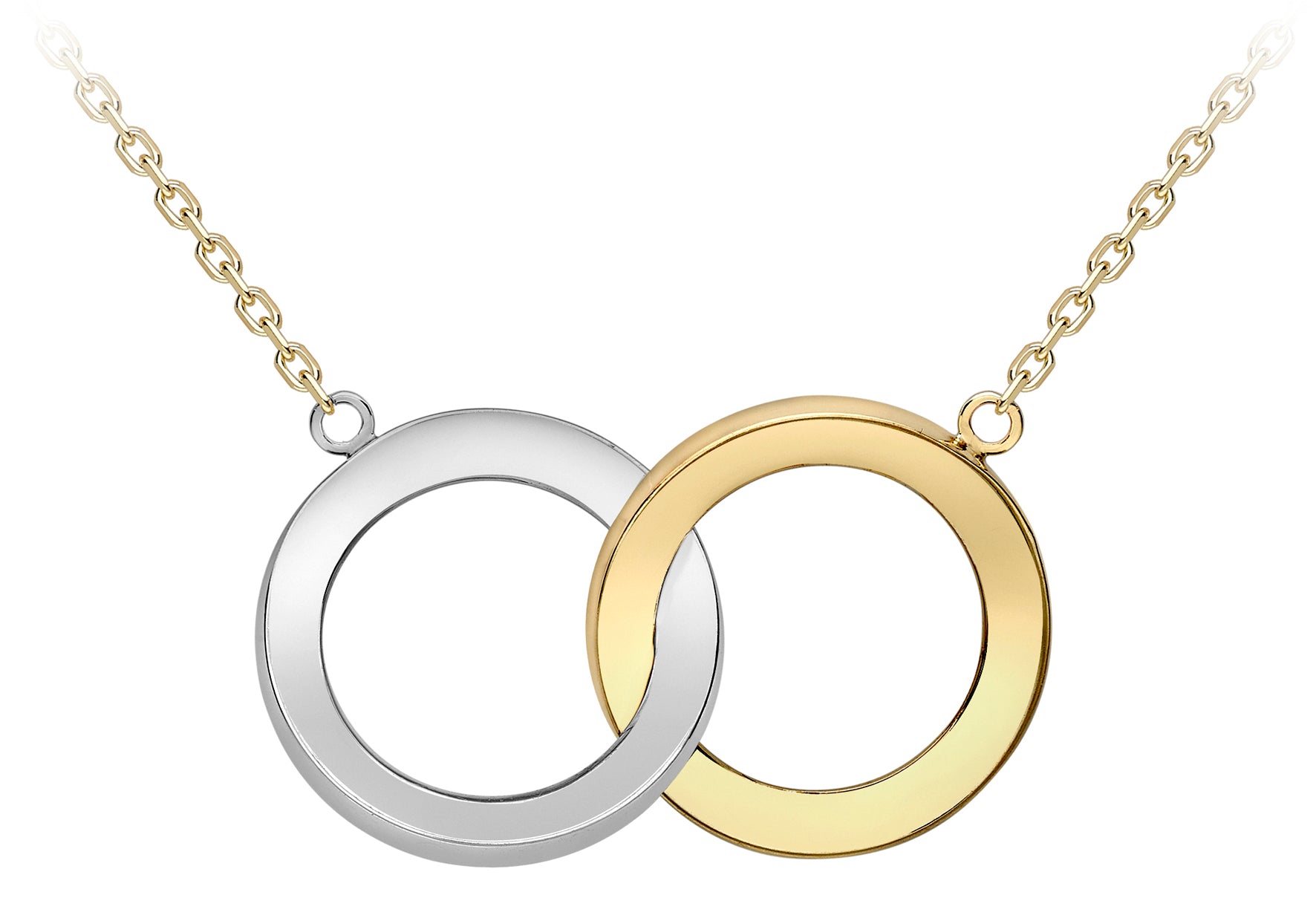 The necklace is a modern design that balances simplicity with detail. At its centre, two polished rings, one in warm yellow gold and the other in crisp white gold, are interlinked to symbolise unity and connection. Each ring is finished with a bevelled edge, adding subtle definition and reflective surfaces that catch the light with movement.