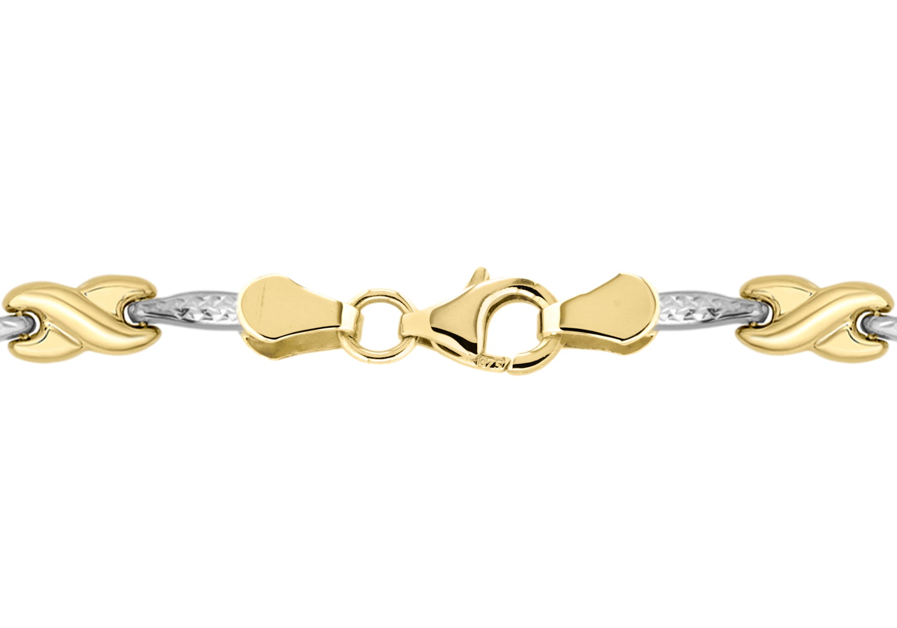 This elegant necklace combines the warmth of yellow gold with the crisp brightness of white gold in a flowing two-tone design. Alternating polished bar links with graceful X-shaped “kiss” links, the necklace is enhanced with diamond-cut detailing that reflects light with refined brilliance.
