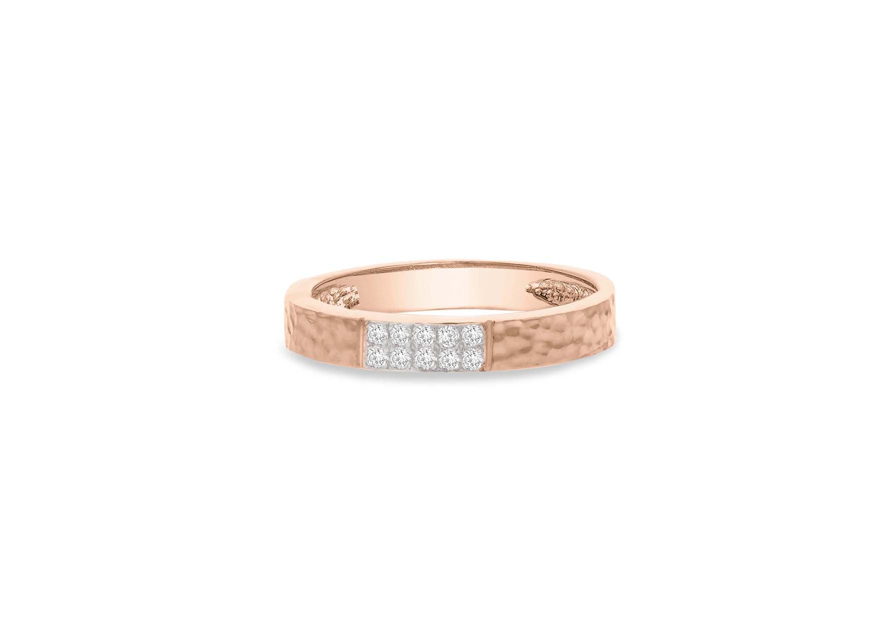 A modern twist on timeless texture, this 9ct rose gold band ring is subtly sculpted with a hand-hammered finish that catches and softens the light across every curve. A delicate line of 0.10ct round brilliant-cut diamonds is flush-set along the surface, adding a refined shimmer without overpowering the organic beauty of the form. It’s a versatile piece that is understated yet distinctive, perfect for stacking, pairing, or wearing solo as a statement of quiet elegance.
