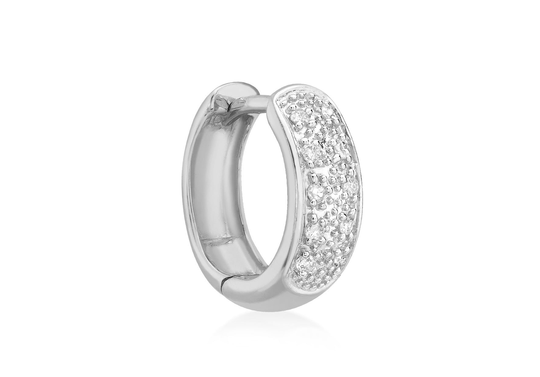 The earring is a sleek design that pairs modern minimalism with refined detail. Crafted in polished white gold, the close-fitting, huggy style ensures a secure and comfortable wear, making it an understated yet versatile piece. The front surface is pavé set with round brilliant-cut diamonds totalling 0.05ct, creating a subtle shimmer that complements the cool, silvery tone of the gold.