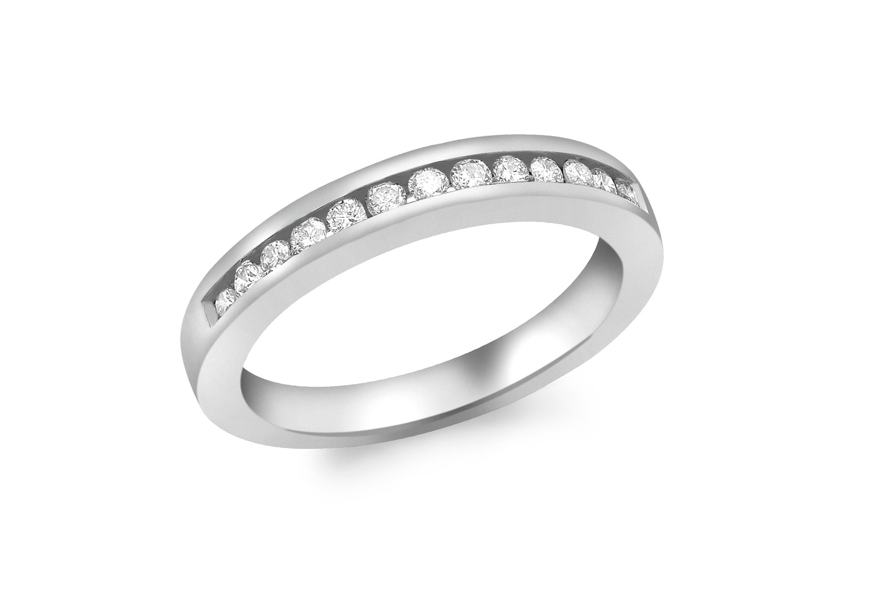 Details: 13x Diamonds 1.5mm in Diameter Average Carat Weight: 0.25ct Ring Shank: 2.5mm Setting: Channel Stone Details: Diamond Style: Stone Set Product Type: Rings Metal Colour: White Metal: 9ct Gold