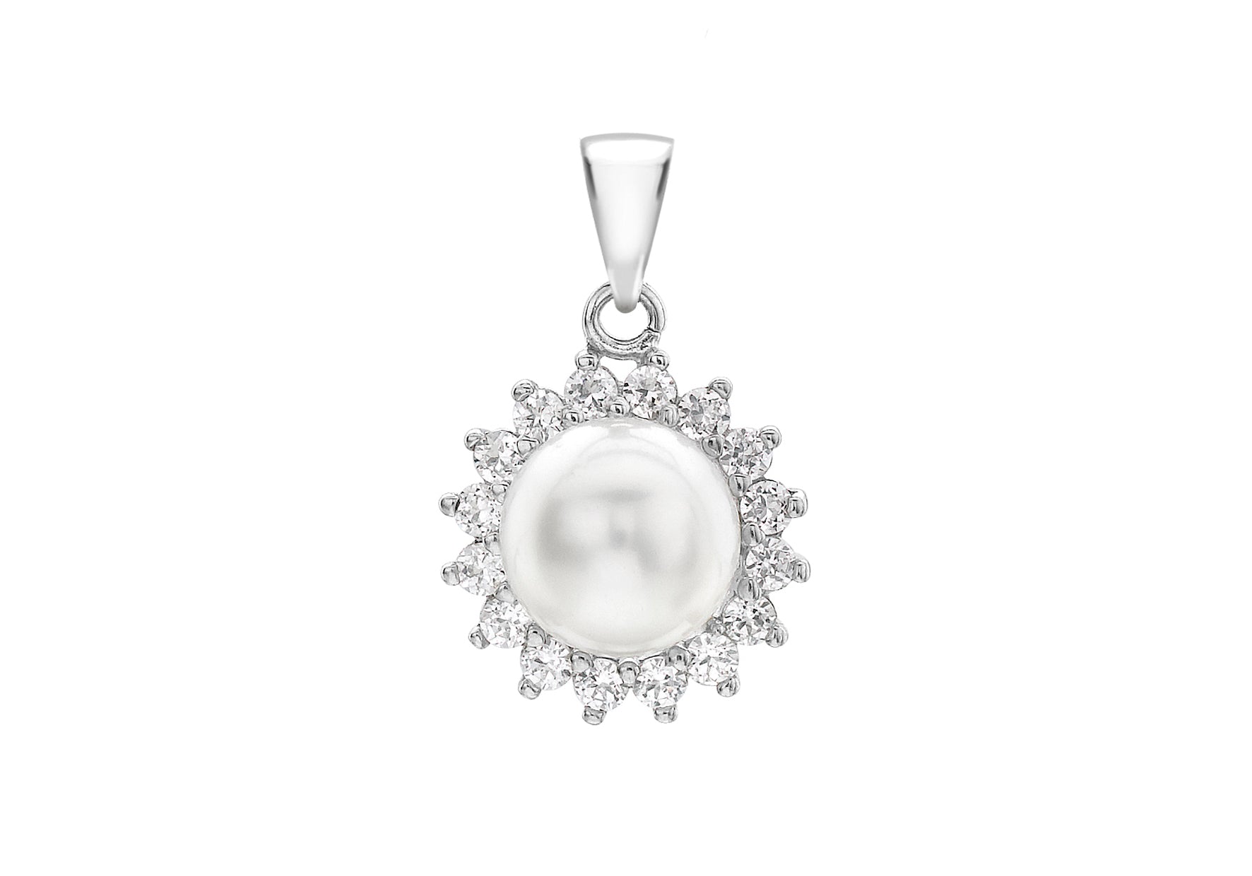 Pendant Height: Including Bail 20mm Pendant Width: 12mm Finish: Polished Setting: Claw Stone Details: 1 x 8mm Round Pearl, 16 x 2mm Round White CZs Style: Stone Set Product Type: Pendants Metal Colour: White Metal: 9ct Gold