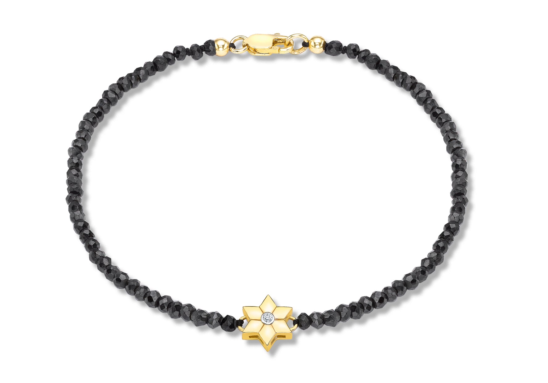 9ct Yellow Gold 0.01ct Diamond Set Flower Charm on Black Spinel Bracelet 19m/7.5"9 Average Carat Weight: 0.01ct; Length: 19cm; Width: 9mm; Setting: Rubover; Clasp: Lobster; Style: Stone Set Metal Colour: Yellow Metal: 9ct Gold