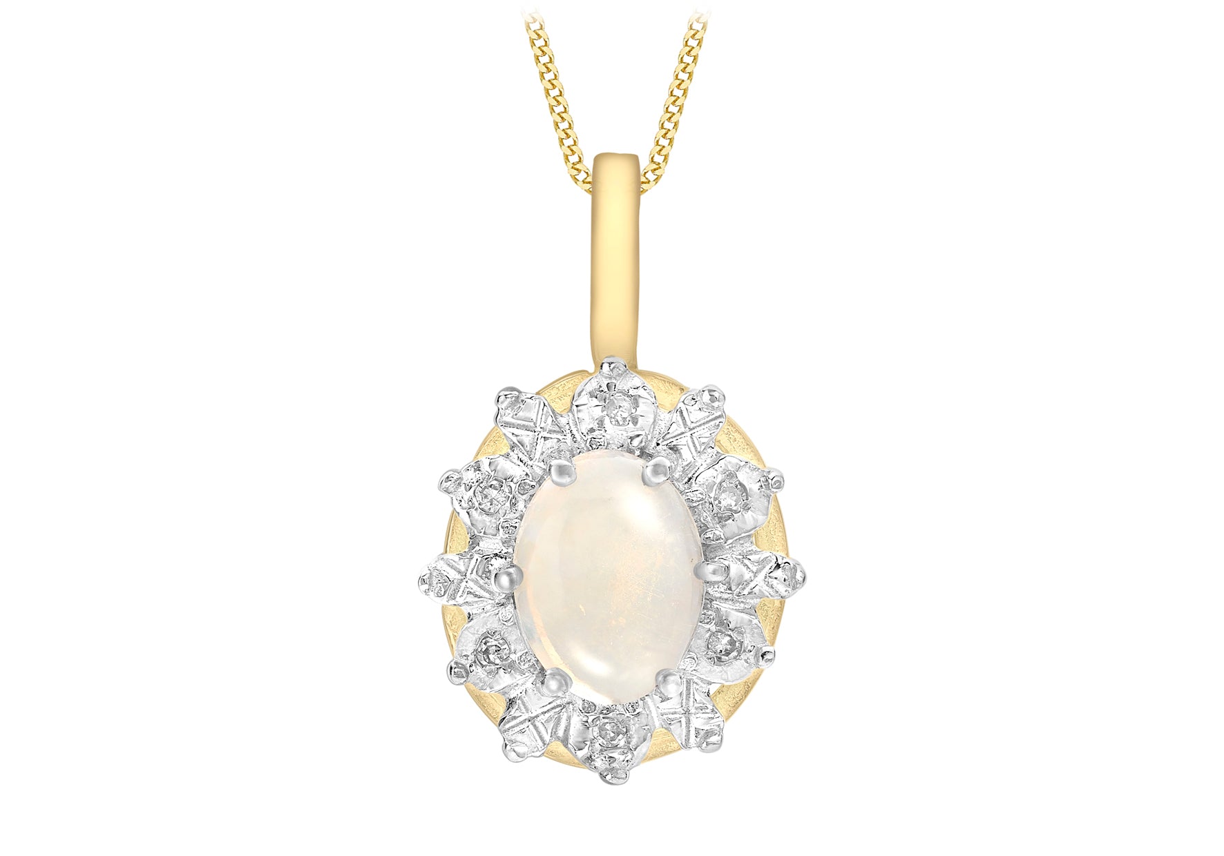 Average Carat Weight: 0.03ct Pendant Height: Including Bail 20mm Pendant Width: 12.5mm Setting: Claw Stone Details: 1x 8mm x 6mm Oval Opal, 6x 1mm Diamonds Style: Stone Set Product Type: Pendants Metal Colour: Yellow Metal: 9ct Gold