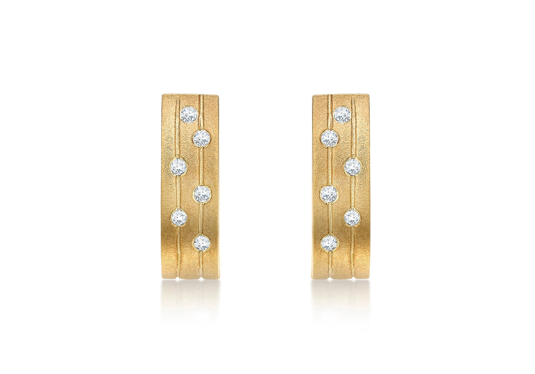 Refined and understated, these earrings offer a contemporary take on diamond elegance. Each earring features a gracefully arched bar design, set with a row of brilliant-cut diamonds totalling 0.12 carats. The subtle curvature and fluid silhouette create a sense of movement, while the warm gold provides a rich contrast to the diamonds’ natural radiance.