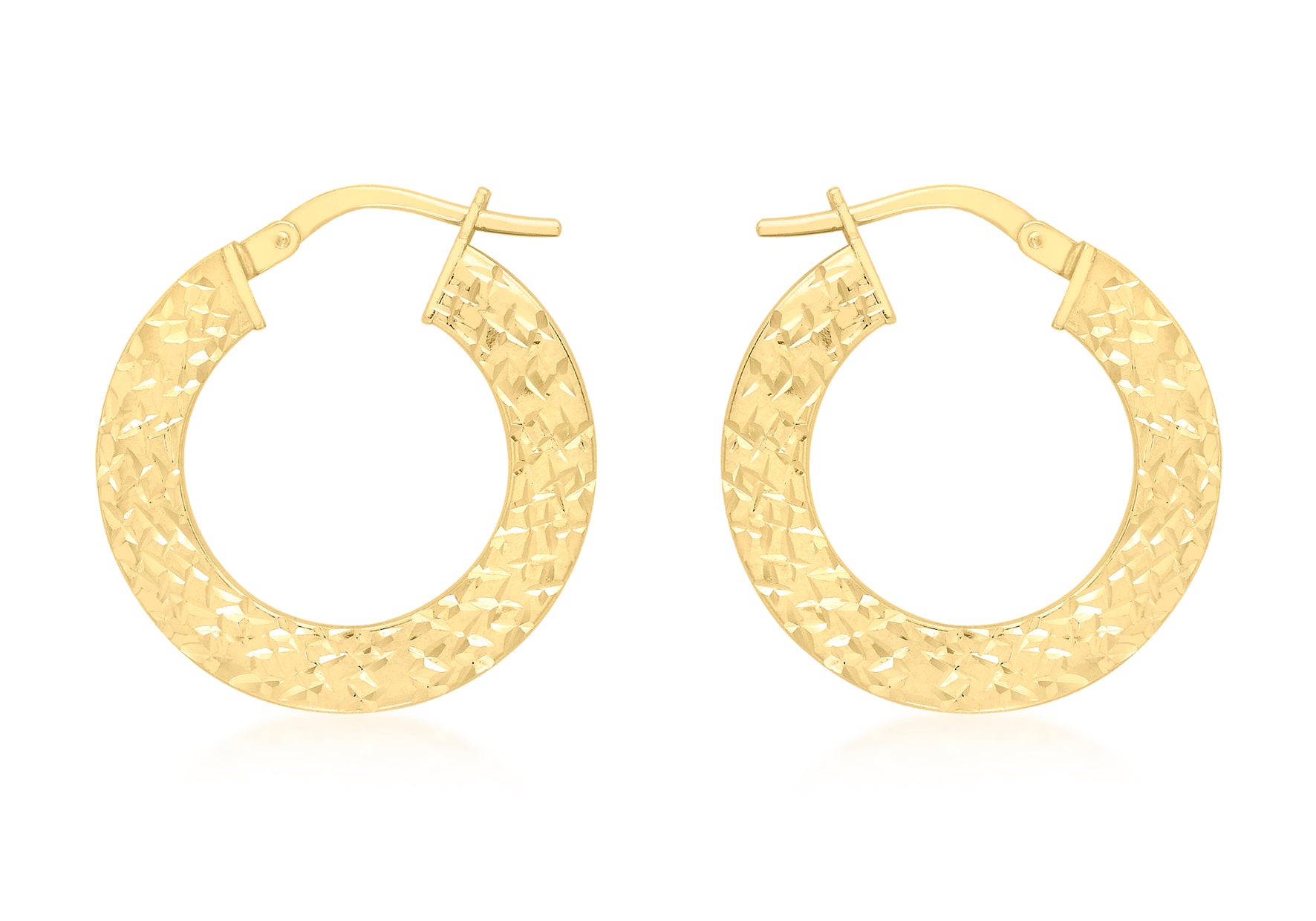 These earrings combine classic form with textured brilliance. Each hoop is shaped with a flat profile and enhanced by diamond-cut detailing, creating faceted surfaces that catch and reflect light from every angle. The warm tone of polished yellow gold adds depth and contrast, giving the earrings a refined radiance.