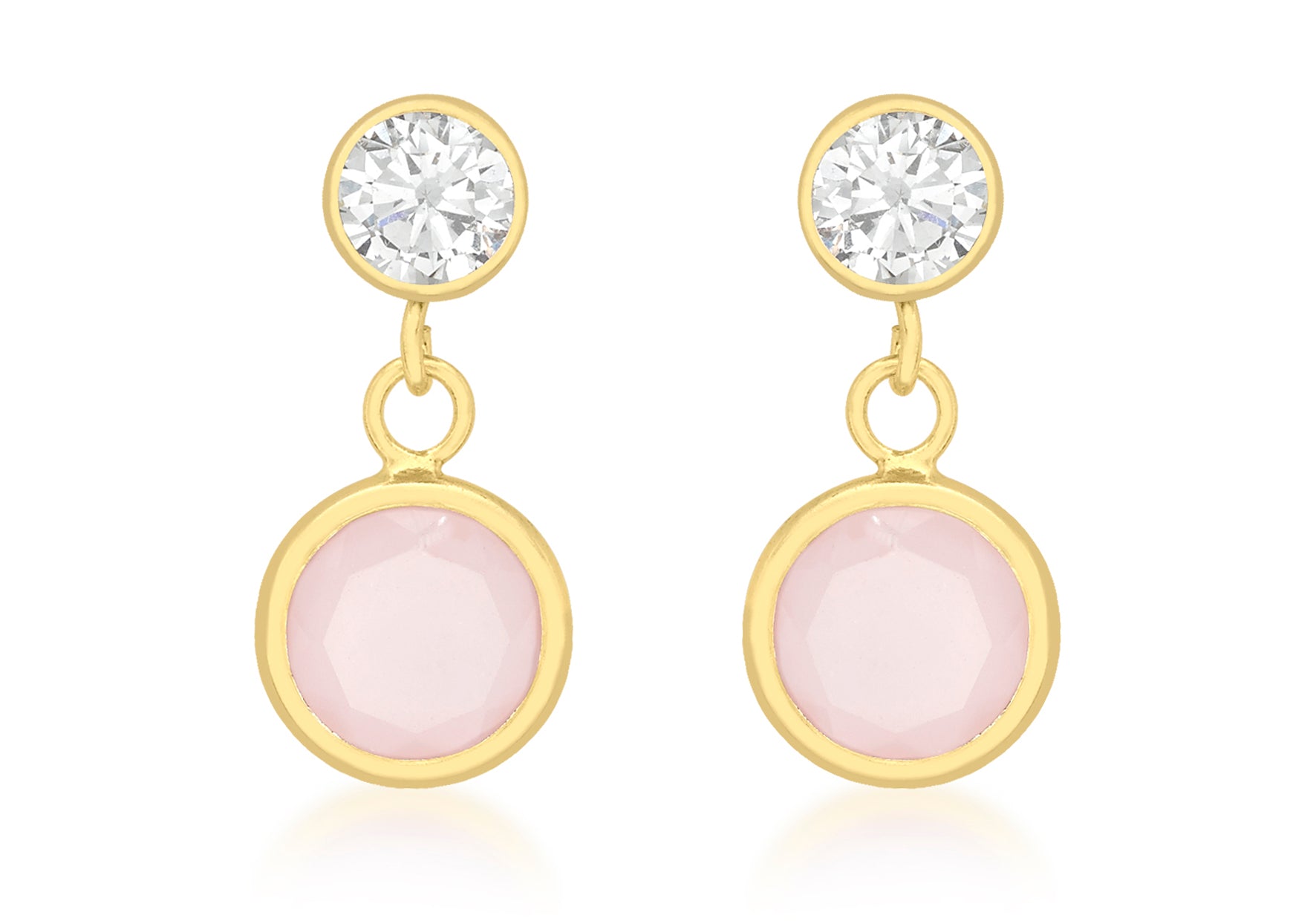 Width: 7mm Height: 14mm Fitting: Post Setting: Rubover Stone Details: 5mm CZ Stones/6mm Pink Crystals Style: Drop Product Type: Earrings Metal Colour: Yellow Metal: 9ct Gold