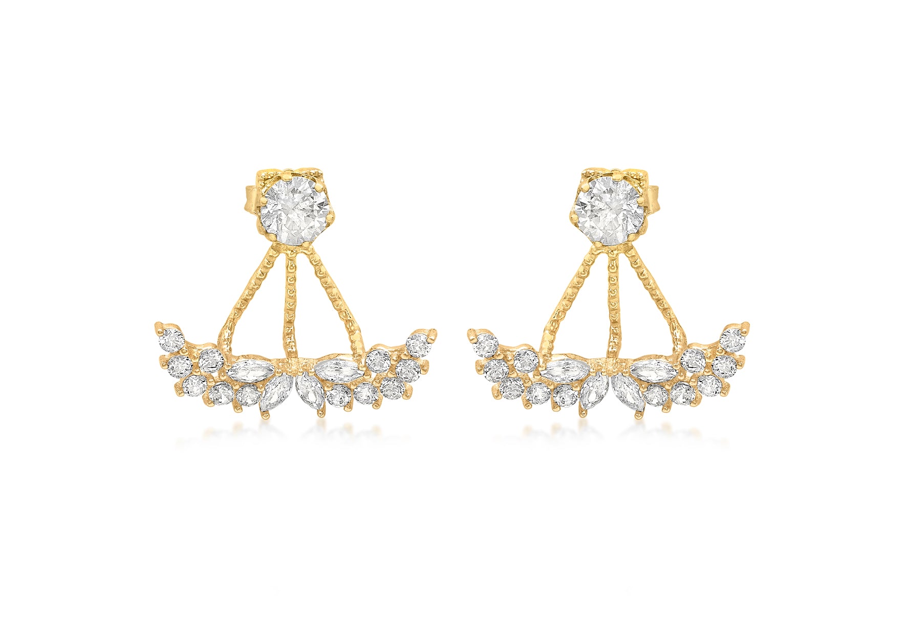 Width: 17mm Height: 14mm Finish: Textured Fitting: Post Setting: Claw Stone Details: 24 x 1.5mm, 2x 4mm Round, 8 x 3mm x 1.5mm Marquise White CZs Style: Jacket Product Type: Earrings Metal Colour: Yellow Metal: 9ct Gold