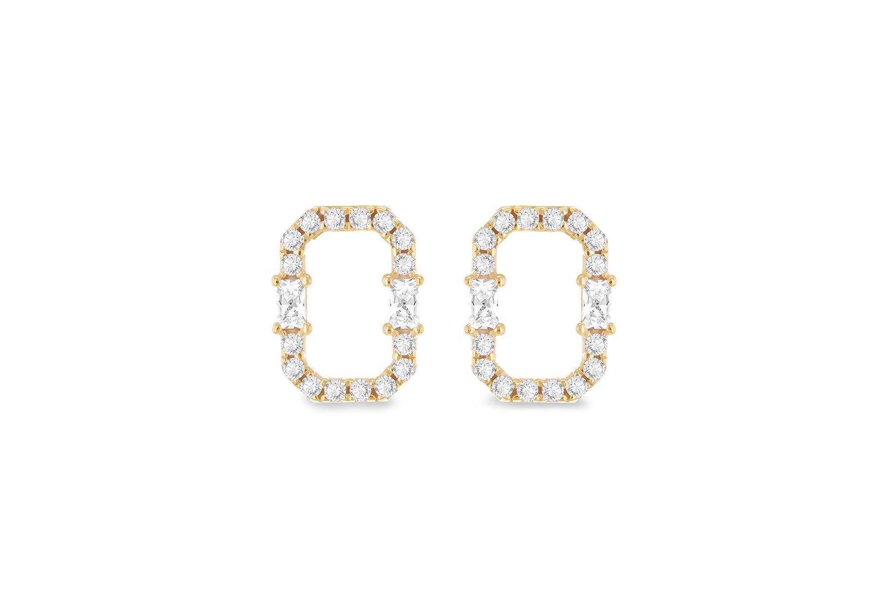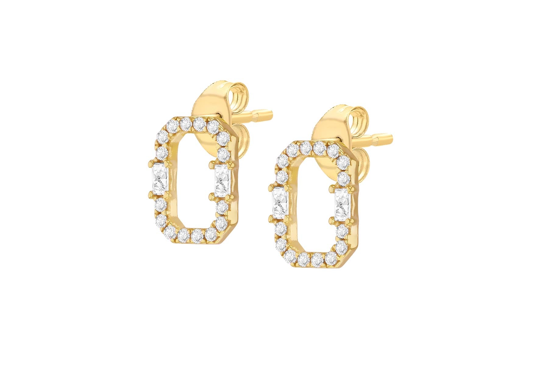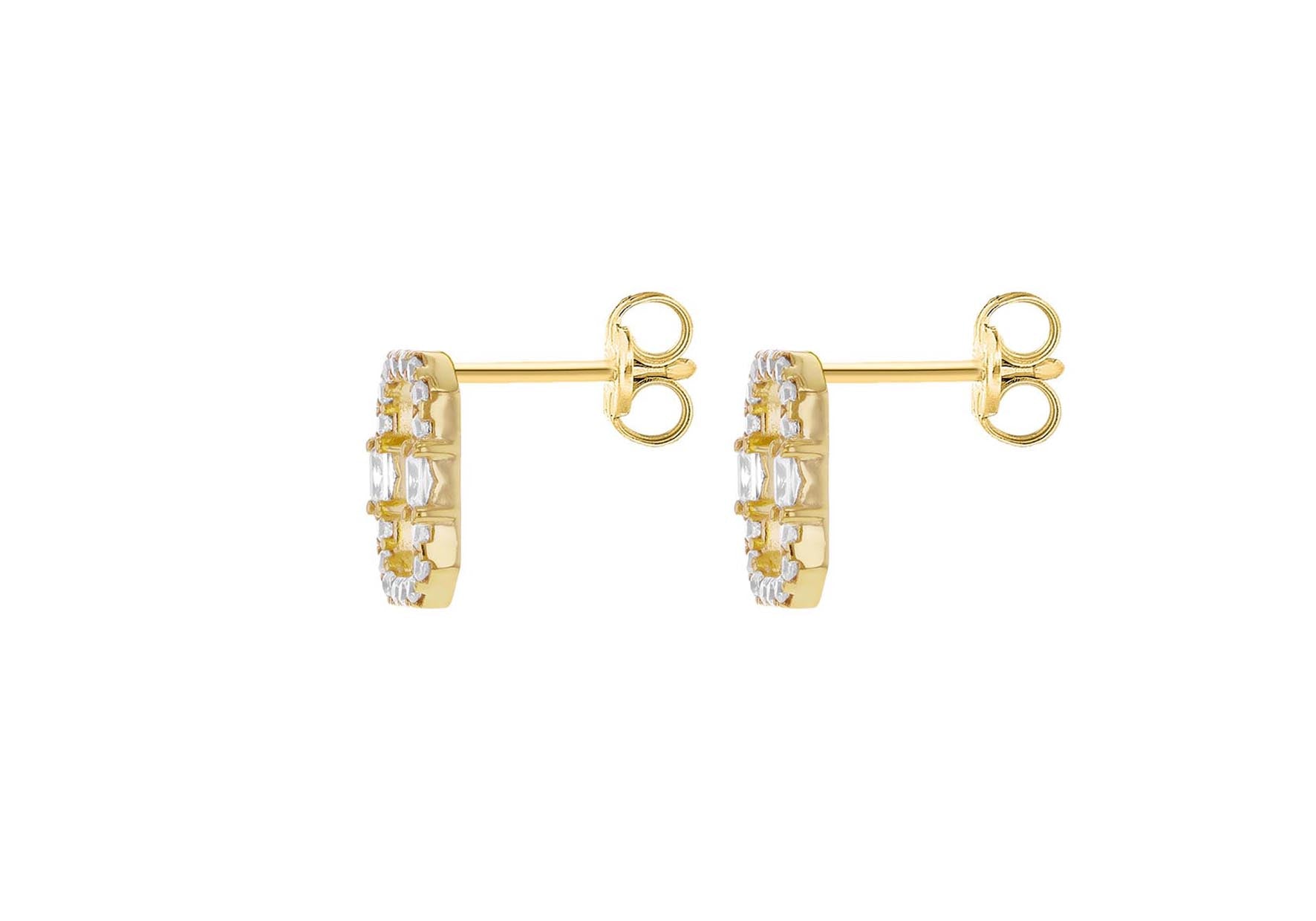 Details: Tube 1.3mm - 1.5mm; Depth 2mm Width: 8mm Height: 10mm Finish: Polished Fitting: Post Setting: Pave Stone Details: 16 x 1.2mm Round White CZ & 2 X (2.5mm x 1.5mm) Baguette White CZ Style: Stud Product Type: Earrings Metal Colour: Yellow Metal: 9ct Gold