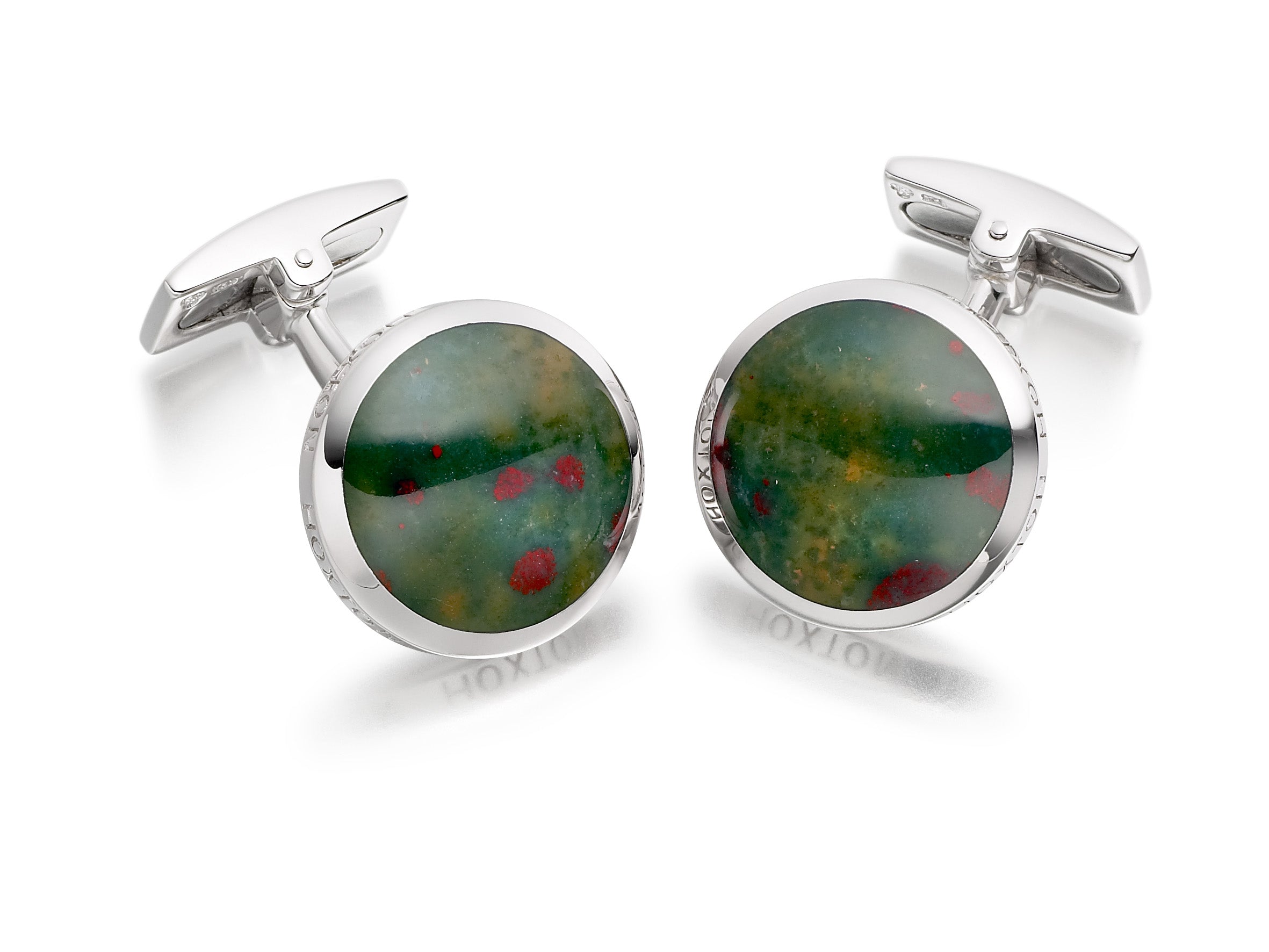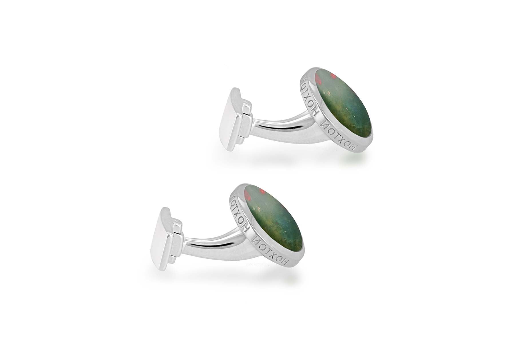 These cufflinks offer a refined blend of classic and modern style, featuring polished sterling silver settings in a sophisticated round design. Each cufflink is set with a striking green jade stone, delivering a unique touch of colour and depth. Measuring 25mm across, these cufflinks are meticulously crafted for comfort and presence, making them an elegant finishing detail for formal or smart-casual dress. Presented in a luxury box, they embody Hoxton London's tradition of expert silversmithing and understated British design.