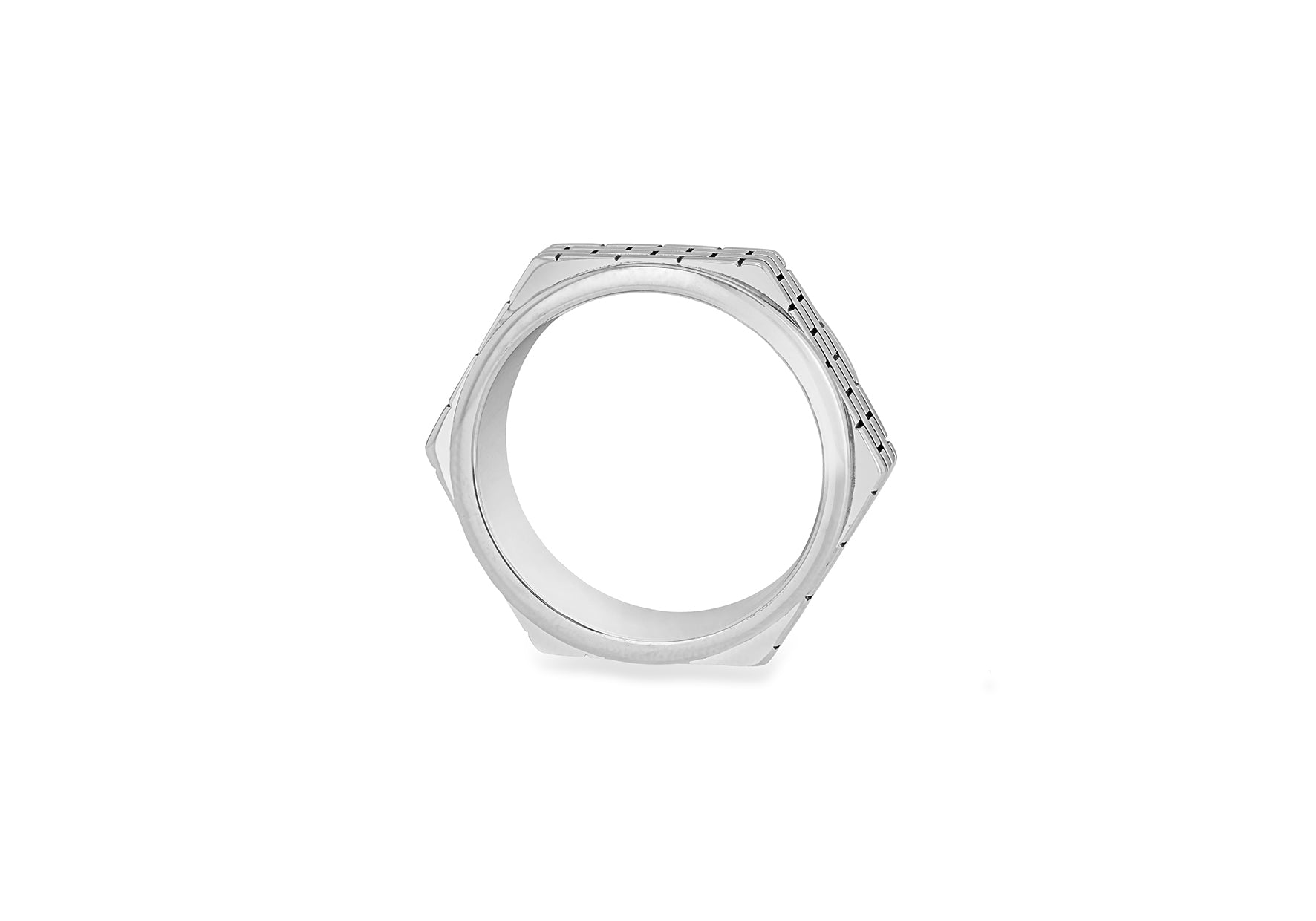 This ring combines tactile design with refined craftsmanship. Featuring a hexagonal profile and a precisely detailed brick-patterned spinning band, it offers both structure and movement in a contemporary form.