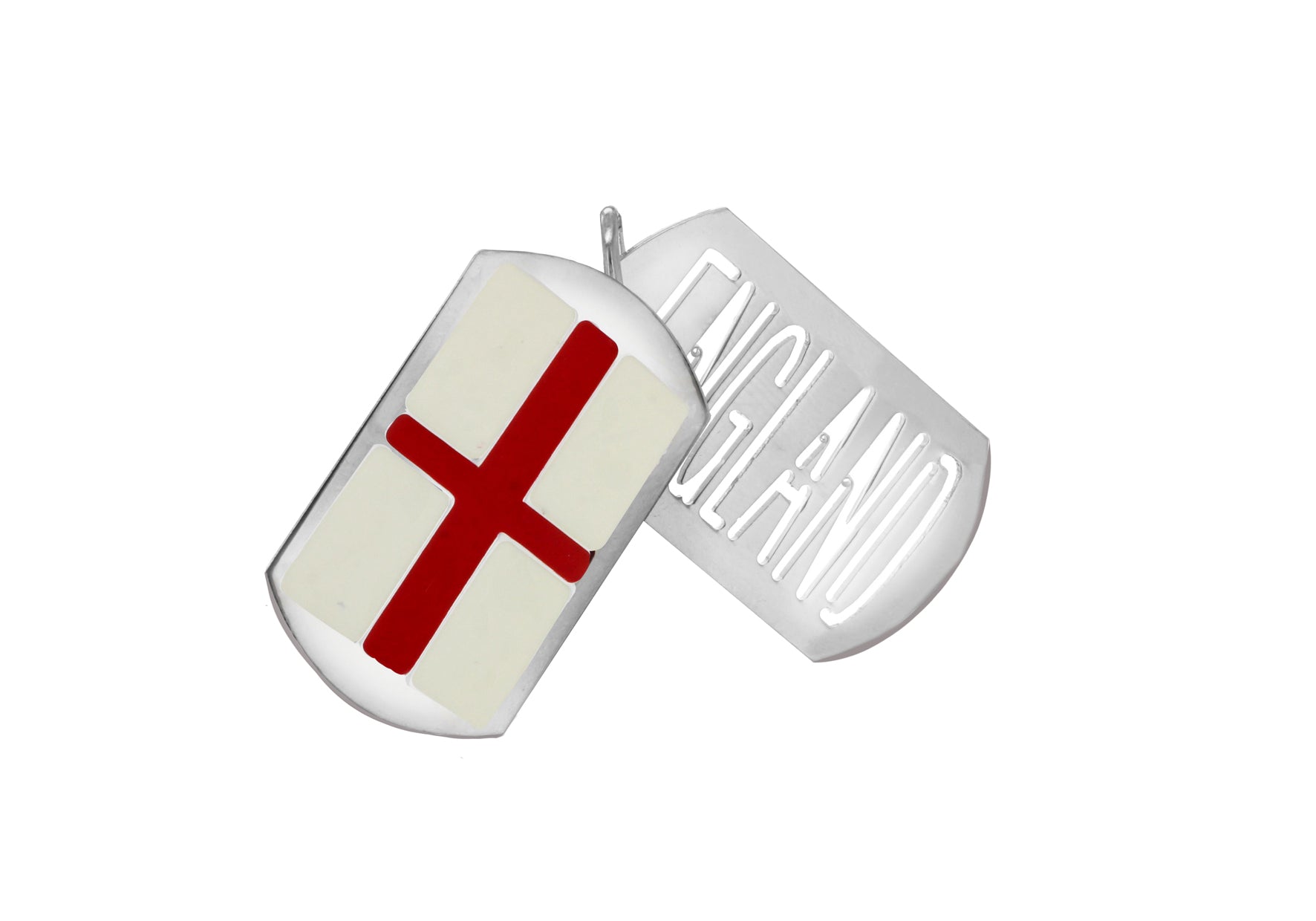 A bold tribute to English pride, this double tag pendant features a high-polish sterling silver design paired with vibrant red and white enamel detailing. One tag proudly displays the St George’s Cross in precision-applied enamel, while the second is engraved with ‘ENGLAND’ in a clean, modern font, offering a subtle contrast between colour and shine.