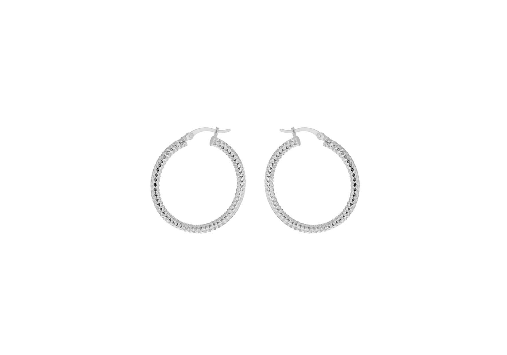 Details: Round Tube Width 3mm Diameter: 25mm Finish: Diamond Cut Fitting: Hinged Post Style: Creole Product Type: Earrings Metal Colour: Silver Metal: Silver