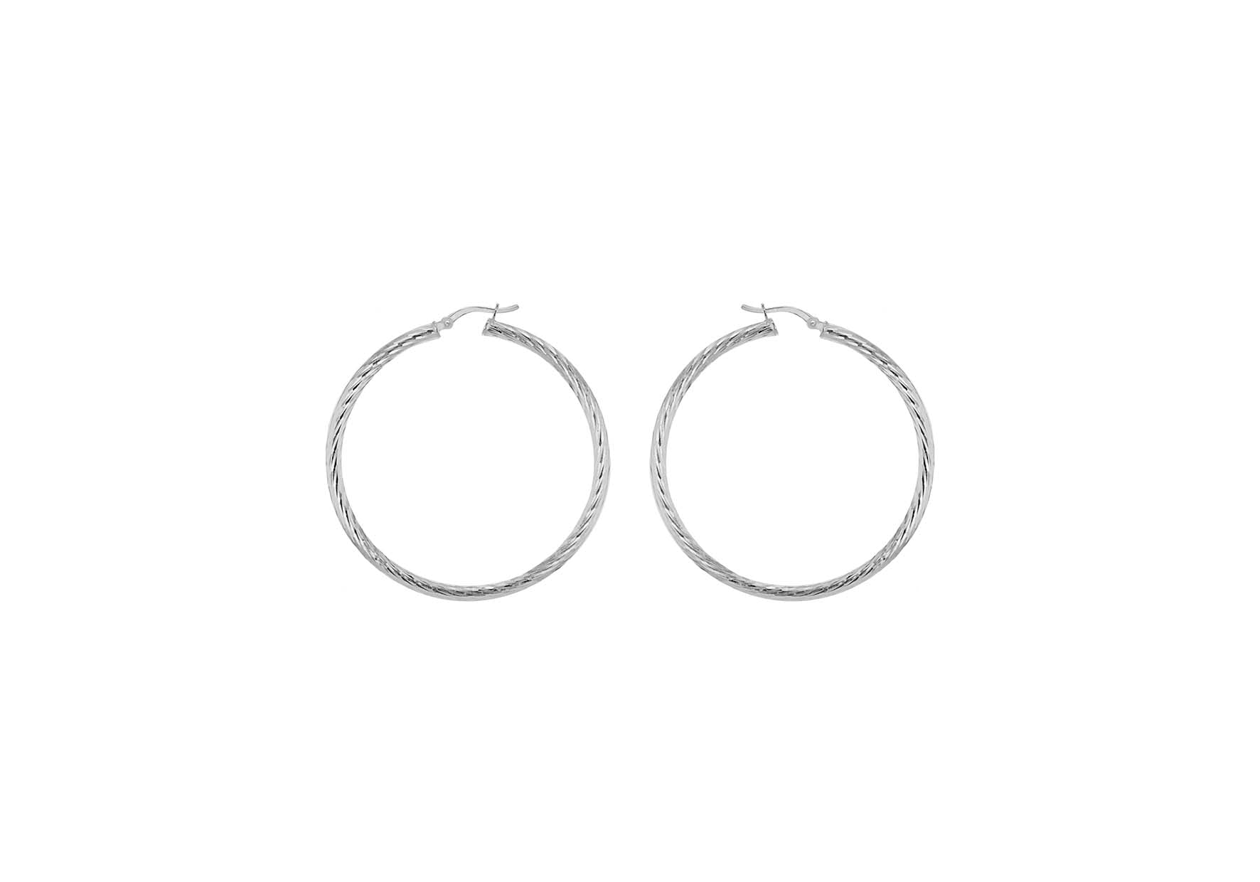 Details: Round Tube Width 3mm; Diameter: 35mm; Finish: Diamond Cut; Fitting: Hinged Post; Style: Creole Metal Colour: Silver Metal: Silver