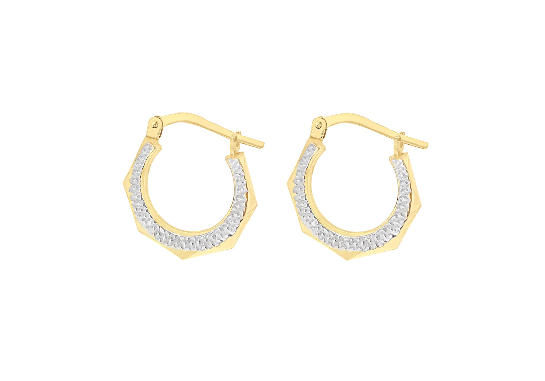 Details: Tube width 2.2mm-3.2mm; Diameter: 16mm; Gold Details: Sterling Silver & 9ct Gold; Finish: Diamond Cut; Fitting: Hinged Post; Style: Creole Metal Colour: 2 Colour Metal: Silver