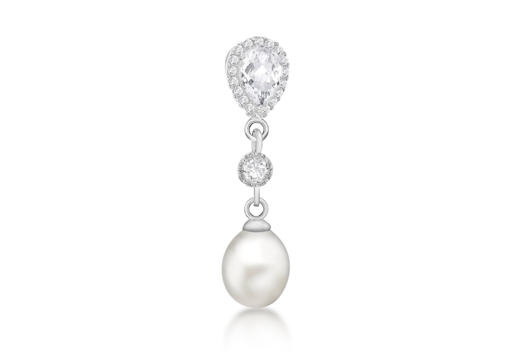 Pendant Height: 31mm; Pendant Width: 7.4mm; Finish: Polished; Setting: Claw; Stone Details: 1 x Fresh Water Pearl, 1 x 7.5mm x 5mm Pear Shaped White CZ, 1 x 3mm Round White CZ, 18 x 1mm Round White CZs; Style: Stone Set Metal Colour: Silver Metal: Silver