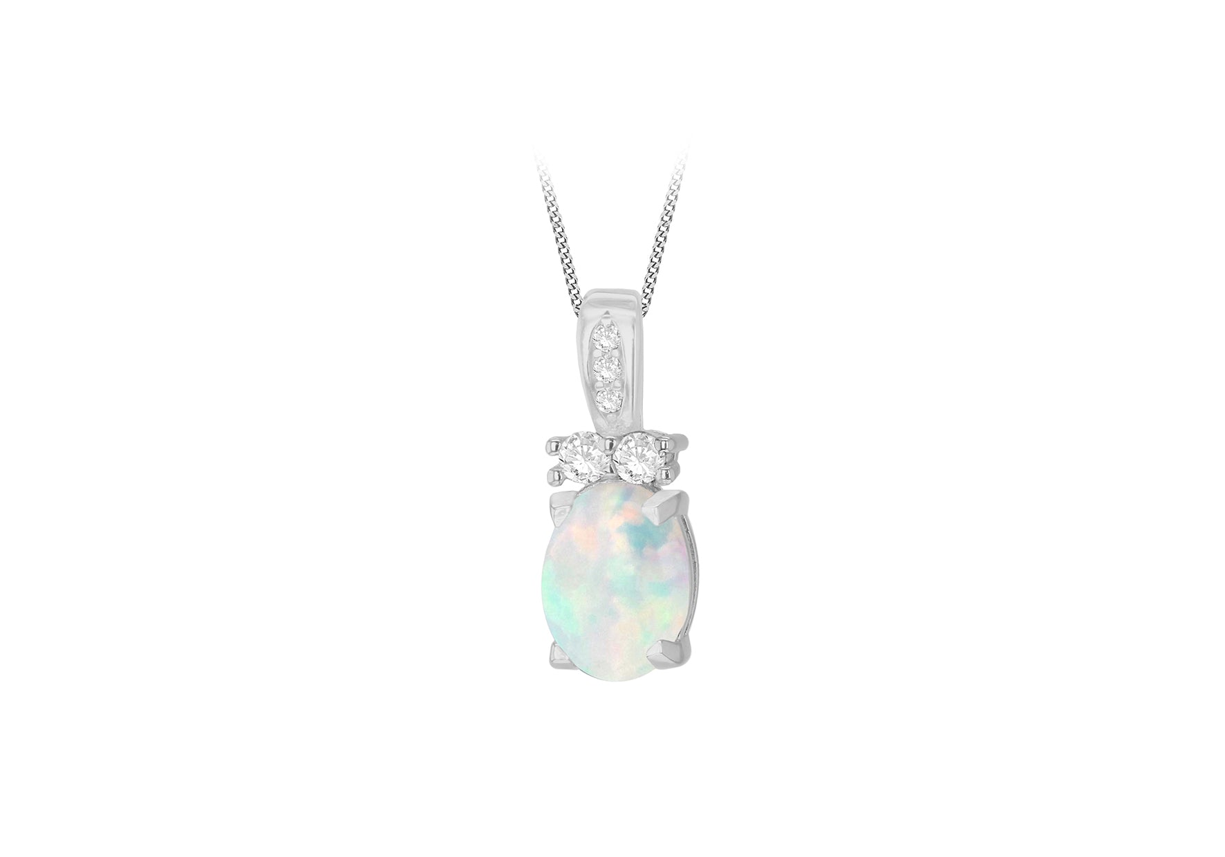Pendant Height: Including Bail 16mm Pendant Width: 6mm Finish: Rhodium Plated Setting: Claw Stone Details: 1 x 6mm x 8mm Oval Synthetic Opal, 2 x 2mm and 3 x 1mm Round White CZs Style: Stone Set Product Type: Pendants Metal Colour: Rhodium Metal: Silver