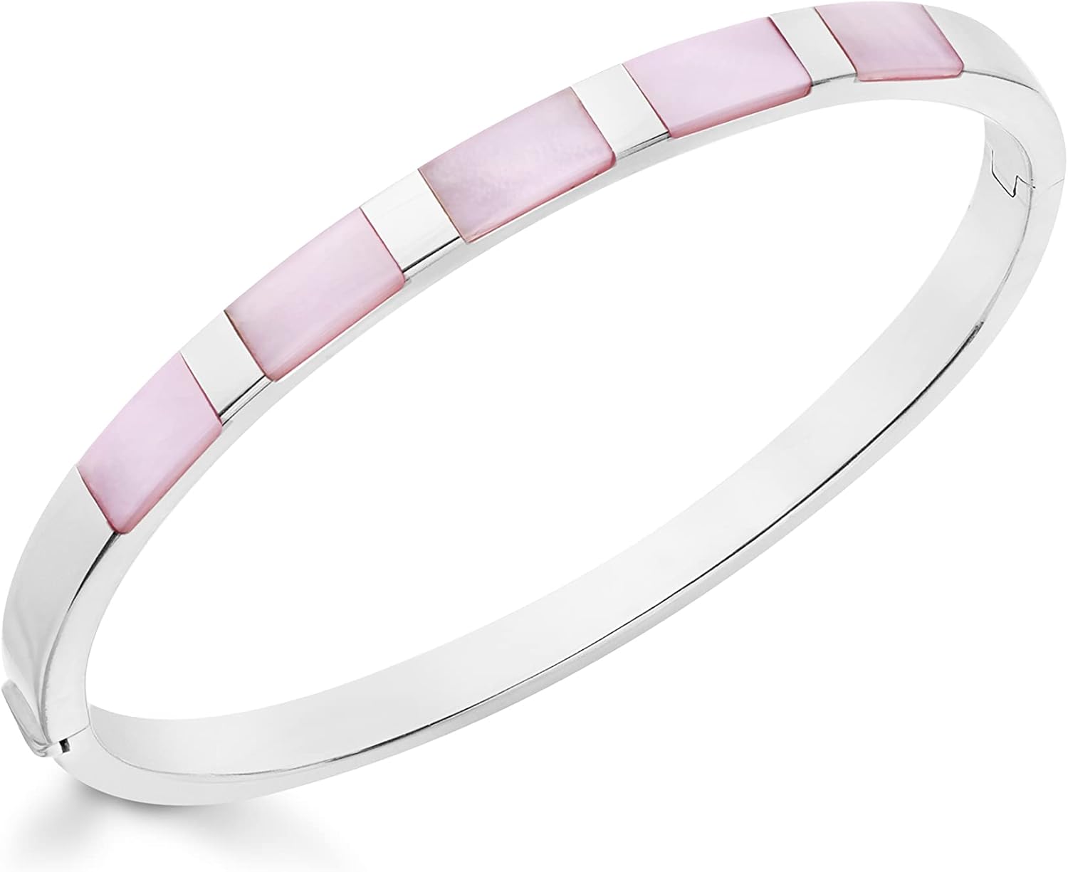 This sterling silver bangle features a sleek row of polished pink mother-of-pearl inlays, creating a refined linear design that wraps smoothly around the wrist. Slim and contemporary, the oval-shaped cuff highlights the soft blush tones of the stones against a high-shine silver backdrop for understated colour and elegance.